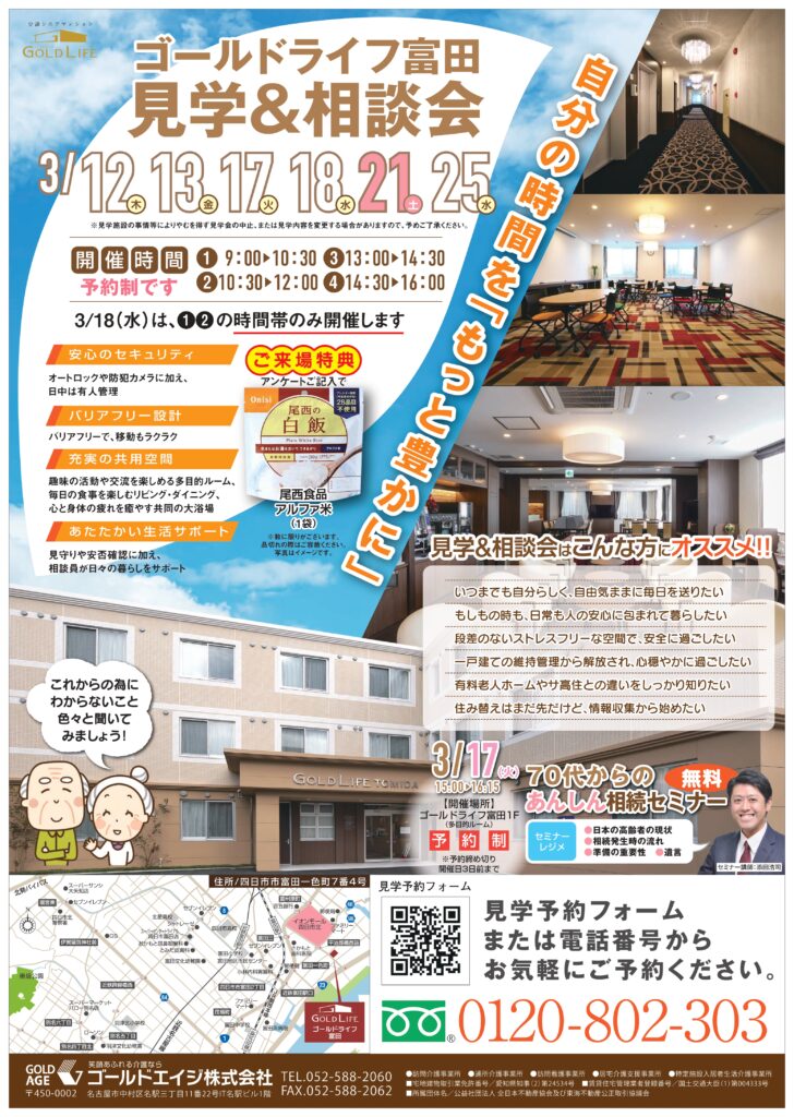 ゴールドライフ富田では、2026年3月度の見学&相談会を開催いたします。