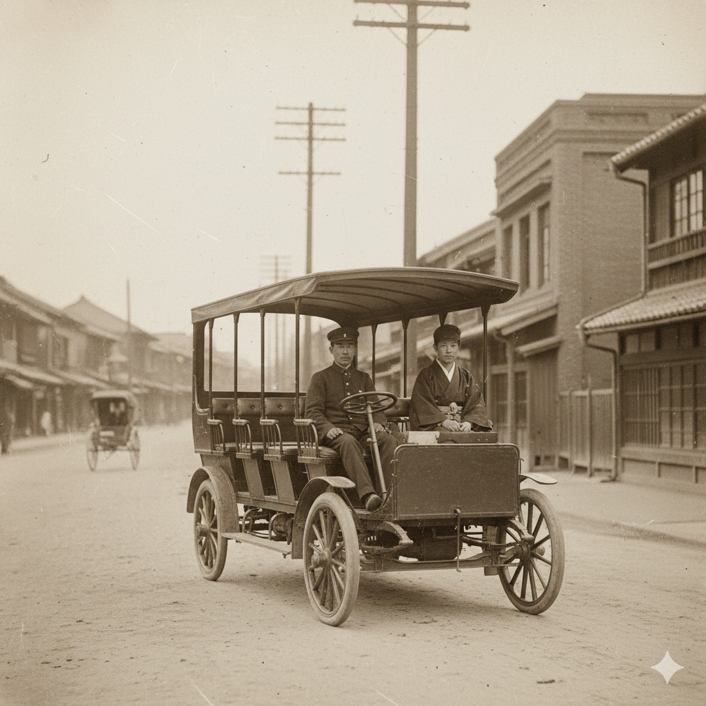 そんな中、蒸気自動車を改造した6人乗りのバスを、京都駅と祇園の間で走らせたのが始まりでした。今のバスからは想像もつかない、まるで馬車のような姿です。当時の人々にとって、それはまさに「未来の乗り物」だったことでしょう。
